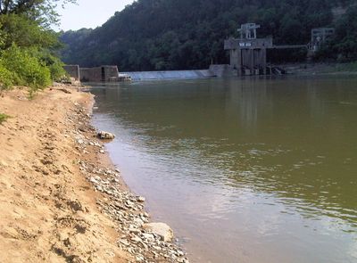 The path down to the river is a bit treacherous, but well-used. You will see the path on the river side of the road, about 50 feet in front of the No Trespassing sign. Depending on the water level, there is a sandy beach below the lock and dam. Don’t try to go down there when the water is high.